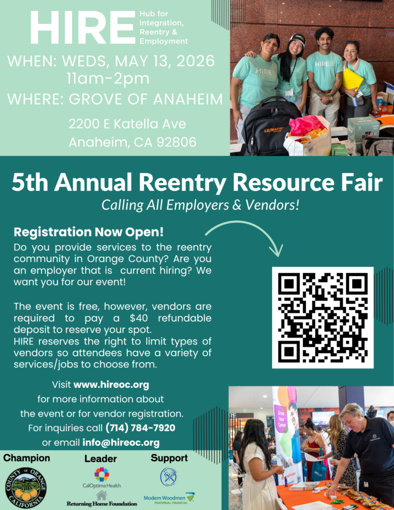Join HIRE on May 13th for our 5th Annual Reentry Resource Fair at the Grove of Anaheim from 11am-2pm.